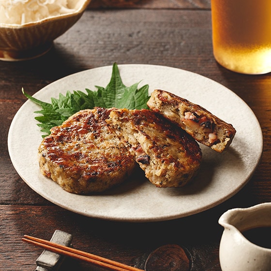 青森県産ムラサキイカの胴体とゲソを細かく刻んでふんだんに使用し、刻んだ大葉を加え歯ごたえと風味の良い海鮮ハンバーグに仕上げました。 国内原料にこだわり、青森県産のムラサキイカを使用しています。またイカをしっかり味わえるよう50%配合しています。 ■食感と味付け