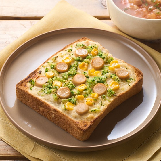 北海道牛乳100%を使用し、玉ねぎをじっくり煮込んでうま味と甘味を引き出したホワイトソースに、ブロッコリーとソーセージとコーンをトッピングしました。 まろやかでやさしい味わいですので、朝からでも重たくなりすぎず食べやすいです。軽めのランチにもおすすめです。 ■Oisixオリジナル食パンを使用(5枚切)