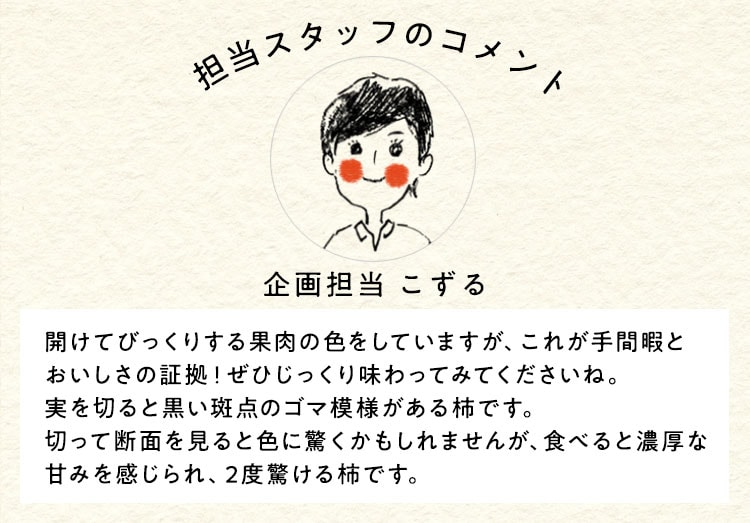 開けてびっくりする果肉の色をしていますが、これが手間暇とおいしさの証拠!ぜひじっくり味わってみてくださいね。実を切ると黒い斑点のゴマ模様がある柿です。切って断面を見ると色に驚くかもしれませんが、食べると濃厚な甘みを感じられ、2度驚ける柿です。