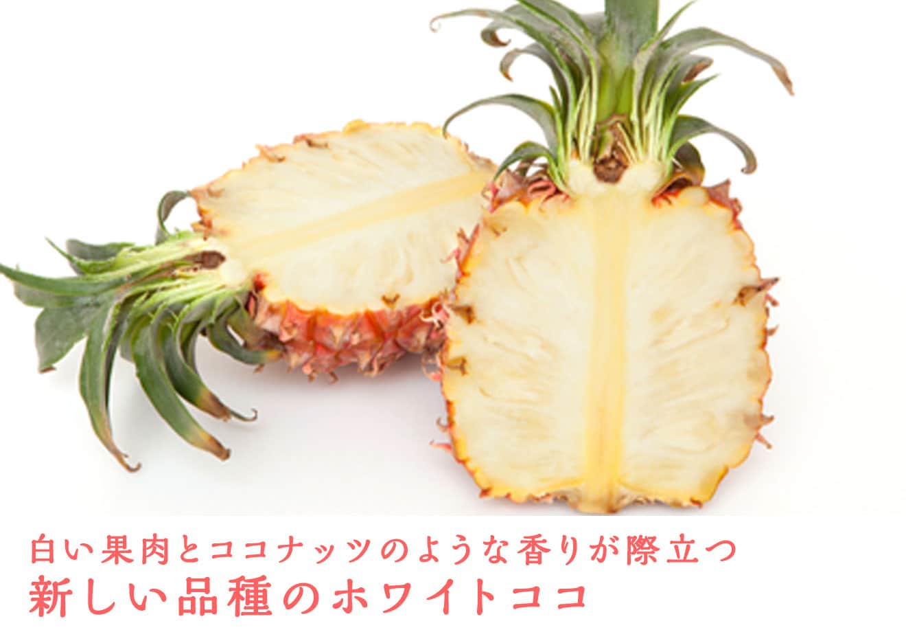 ココナッツのような香りが特徴的で、甘みが強く、酸味が少ないため食べやすいパイナップルです。 白色の果肉で香りがあるパイナップルの品種「ゆがふ」と桃の香りがする「ソフトタッチ」を掛け合わせて作られ2021年12月に品種登録された新しい品種です。