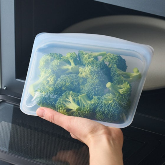 電子レンジ、オーブン、湯せんでの調理、冷蔵、冷凍での保存、ポーチとしての使用など幅広くお使いいただけます。食洗器での洗浄が可能です。
