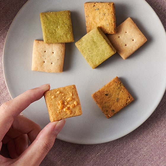未利用になっている国産野菜をミニサイズのおつまみクッキーに生まれ変わらせました。塩気のきいた生地にほんのりとした甘さ、スパイス・チーズを合わせたセイボリークッキーです。 ほんのり香るバジルとトマトが好相性の(とまと&バジル)、山椒がピリッと香る(グリーンリーフ&山椒)、焼いたチーズの香ばしさと粒々食感が特長的な(にんじん&チェダー)、バ ニラの甘い香りを塩気が引き立てる(さつまいも&塩バニラ)の4種類入り。 ワインなどのお酒のおつまみに、ティータイムのお供にどうぞ。 ■野菜のおいしさを丸ごと閉じ込める粉末技術