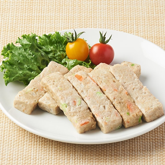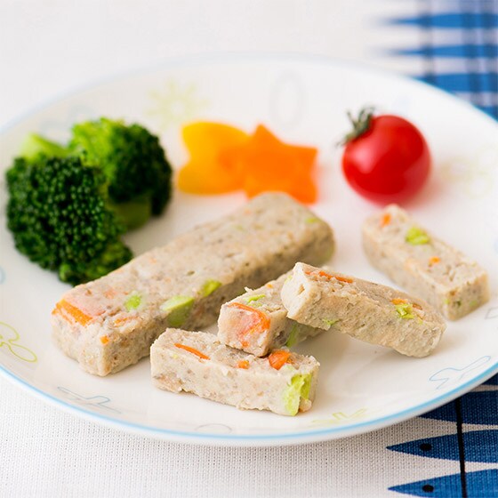 国産のいわしと白身魚と、国産大豆100%のお豆腐を使い、にんじんやえだまめで彩りを加えました。最低限の調味料だけで作っていますので、素材の味を存分にお楽しみいただけます。お子さんが手づかみして食べやすいよう、長方形の形に成型しました。 ■ボロボロとこぼれさせない、でも食べやすいよう柔らかい食感に仕上げています。
