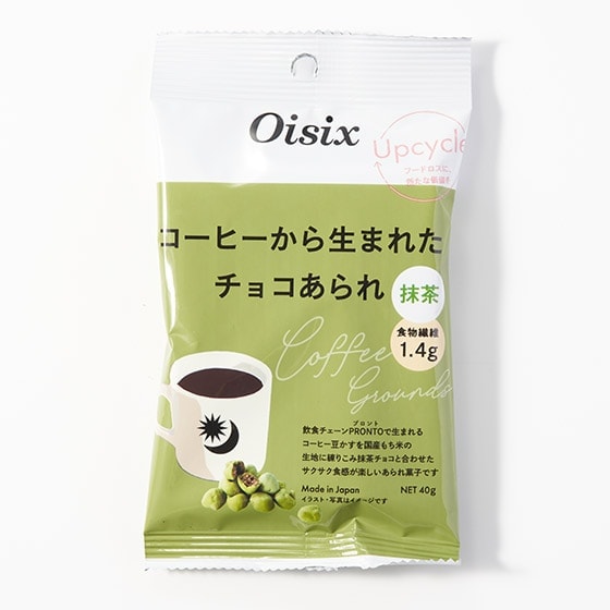 コーヒー豆かすを国産もち米の生地に練りこみ、コロコロとした形状に焼き上げた、サクサク食感が楽しいあられ菓子です。ホワイトチョコレートと抹茶のチョコレートで仕上げた、オリジナル配合の抹茶チョコレートをコーティング。ホワイトチョコレートを含めることで、ほどよい苦みに甘みあるチョコレートに仕上がり、コーヒー味のあられによく合います。1袋40gにコーヒー豆かすを約5.3g活用しています。 ■飲食チェーンPRONTOのコーヒー豆かすを活用