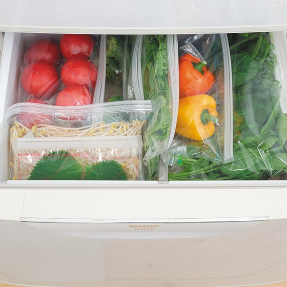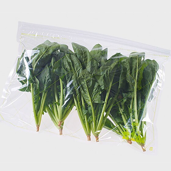 野菜は収穫後も呼吸しています。P-プラスにはミクロの穴が加工されており、バッグの中を「低酸素、高二酸化炭素」の環境で呼吸量を抑えた「冬眠状態」にさせることで鮮度を長持ちさせます。 洗ってくりかえし使えるので経済的、冷蔵庫の野菜室を小分けにすっきりと収納できます。 大きさ:400mm×300mm |