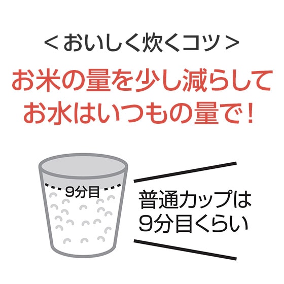金芽米は亜糊粉層が水をたっぷりと吸収し、ふっくらと炊き増えするので、お米を通常よりも1割程度少なくしましょう!1時間程度浸け置きし、炊飯器の白米モードでの炊飯で美味しく炊くことができます。無洗米のため、とがずに炊けます。 夏場は冷蔵保管がオススメです!