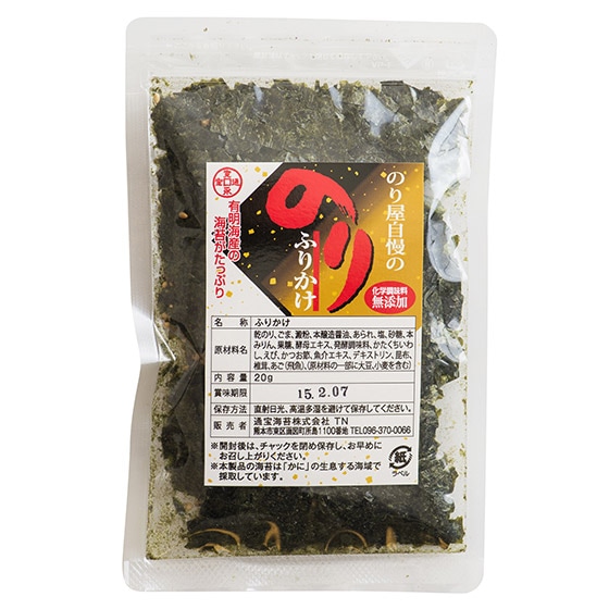 | 原材料 | 乾のり(国産)、いりごま、でん粉、しょうゆ(大豆・小麦を含む)、あられ、食塩、砂糖、みりん、果糖、酵母エキス、発酵調味料、煮干、焼きえび、魚介エキス、かつお削りぶし、黒糖蜜、デキストリン、昆布、乾しいたけ、焼きあご(飛魚) |
