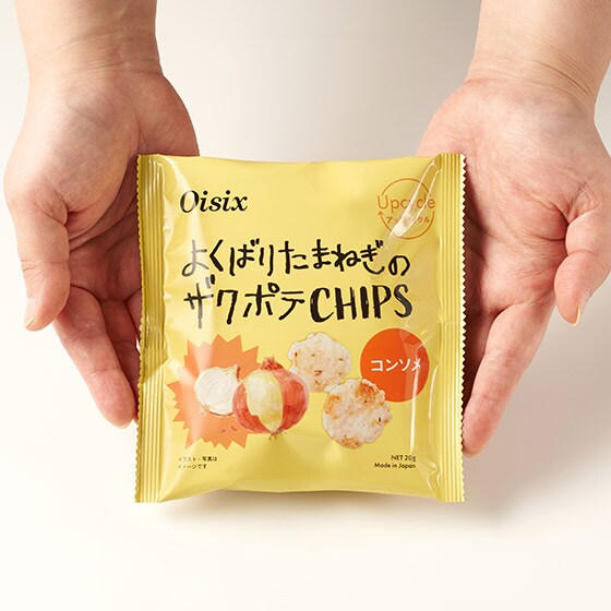 国産じゃがいもの澱粉生地に、マッシュポテトと玉ねぎフレークを練りこみ、コンソメ味で仕上げました。一度高温で焼いたチップスを、カラッと油で揚げることで生まれる香ばしさと歯ごたえが特長です。ついつい手を伸ばしてしまう、お子さまから大人まで幅広くお楽しみいただけるスナックです。 ■ポテトスナックなのに、とてもまじめ。