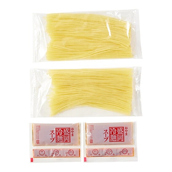 盛岡冷麺の特長のコシのあるつるんとした麺です。冷麺を作る昔ながらの押し出し製法で作っております。高温で生地に圧力をかけ、押出しすことで麺のコシを強くし、ツルンとした独特の食感に仕上げております。 ■麺の主原料を国産原料にこだわっています。