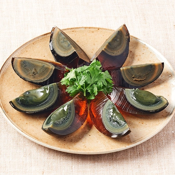ピータンはアヒルの卵を調味液に漬け込み、その後で泥や、もみがらで包んで長期保存を可能にした物です。 白身部分はは黒い透明感があり、少しやわらかい食感です。 もみがらを取りのぞき、カラをむいて適当な大きさに切って、お召し上がりください。 そのまま冷菜として食べる他、ピータン豆腐やスープ、お粥に入れてもおいしいです。 ■お召し上がり方