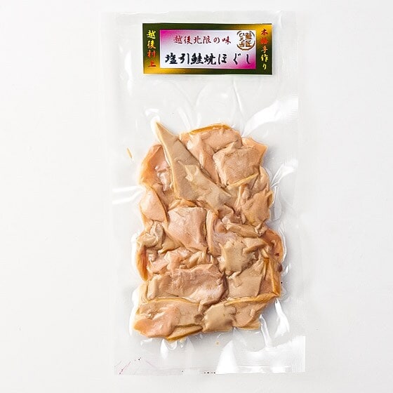 越後村上の郷土料理「塩引鮭」を焼き上げてほぐしました。 鮭の町と言われる越後村上の代表的な郷土料理が「塩引鮭」です。 「塩引鮭」は1尾をそのまま塩蔵して干し上げるため、製造にはとても手間暇がかかりますが、その分旨味が際立ち塩味がしっかり効いた味わいになります。 また、干すことによって身がしまり身離れが良く、ご飯にかけてもおにぎりの具にしても食べ応えがある荒ほぐしになります。 ■熟成された塩味がご飯を美味くする