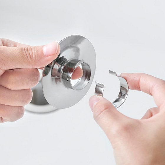 ステンレスのリングをはめるだけのシンプルな構造。リングを回すとロックがかかり、ネットが外れて落下するのを防ぎます。 |