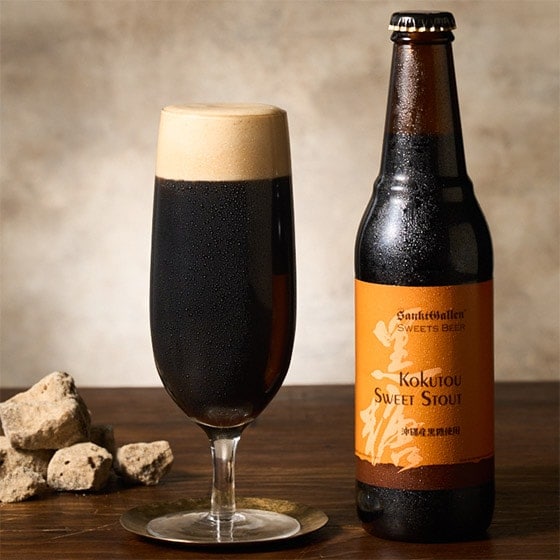 沖縄県産黒糖を使用した黒ビールです。泡までしっかり黒糖風味で、後口にもふんわり黒糖の風味が残ります。 (アルコール分:6.5%、容器口:王冠栓) 黒糖の力強い甘さとのバランスを取るため、ベースの黒ビールも通常よりアルコールを若干高めに、口当たりも濃厚に仕上げています。そのまま食後主として楽しんだり、和菓子と一緒に楽しんでいただくことをお薦めしています。 ■お召し上がり方