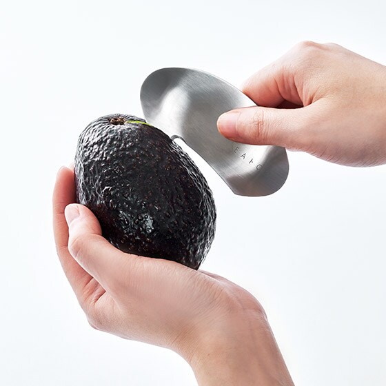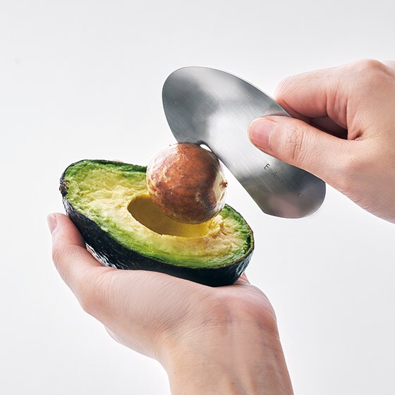 これひとつで皮に切れ込みを入れ、種を除き、スプーン状の部分で実を外せます。ステンレスのアールが手のひらにフィットして、しっかりと握りやすい形状です。柑橘類の皮をむくのにも使えます。 ■EAトCO