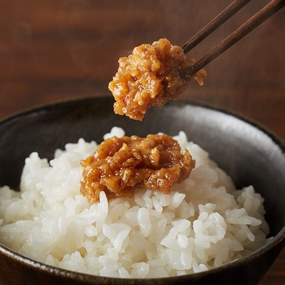 自慢の味噌に国産の鶏肉そぼろ、にんにく、ごま、唐辛子を絶妙に合せた、クセになる旨さの少しピリ辛の具沢山の食べる味噌です。あったかごはんのお供に、ちょっと贅沢なT・K・G、酒の肴、野菜と一緒にどうぞ!! 食パンやお餅に力士みそを塗ってチーズをのせて焼いてもとてもおいしいです。 鶏肉をすりつぶす事なく、ゴロッとした肉の食感で味わえます。