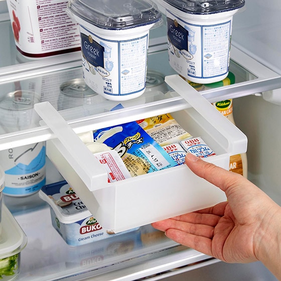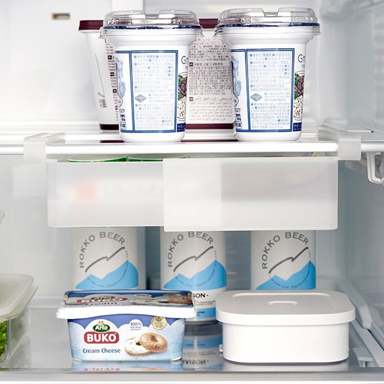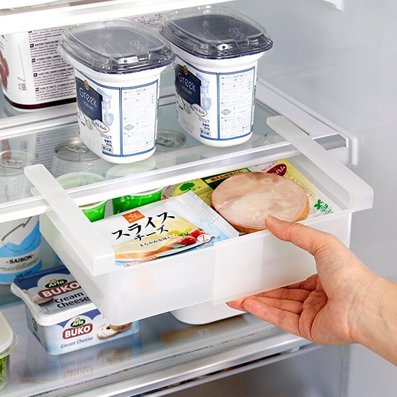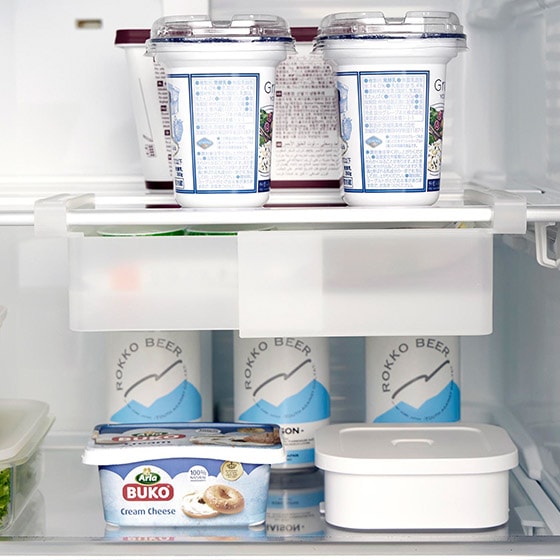 ラックが引き出しやすいよう、手を掛けられるくぼみがあるのでスムーズに出し入れできます。ハムやチーズなどの食品を整理して収納! |