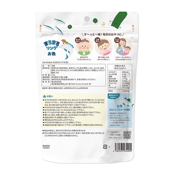 国産発芽玄米とお魚のおいしさがまるごと入った、ノンフライのお米おやつです。 積極的に食べたいお魚を、骨までまるごとパウダーに。 シンプルな原材料で、不足しがちな栄養を考慮した、赤ちゃんのためのやさしいおやつです。1袋(21g)あたりにカルシウム31.5mg、鉄3.6mg、DHA16.8mg ■お召し上がり方