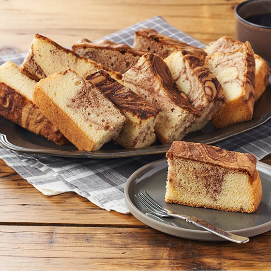 ケーキのようにやわらかく焼き上げた新食感のシフォンです。 無選別で食べやすいようにブロックカットし、どっさり集めてパックしました。 綺麗なマーブル状をめざして製造しています。 ■常温でふんわり、冷やしてしっかり!