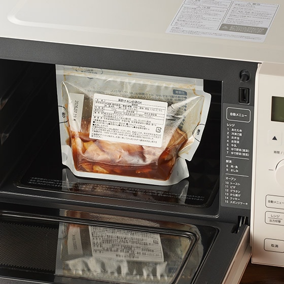 (1)鶏もも肉250g-300g程度を一口大に切り、本品に入れ、中の空気を抜きながらチャックを閉め液をよく揉み込みなじませる。 (2)電子レンジの中でパウチを立てて加熱する。(500W:8分30秒、600W:8分) 加熱後は庫内で約8分蒸らす。 ※加