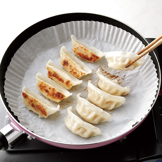 両面をシリコン樹脂加工したフライパン用のクッキングシートです。煮込み料理も焦げ付きにくく、油なしで餃子も焼いたり、フライパンで焼き魚も上手に焼けます。水や油も通しにくく、蒸気だけを適度に通すのでフライパンのお手入れラクラク。250度までのオーブン料理にも使えます。サイズは底径21cm×高さ4cmで26cm以上のフライパンで使えます。 |