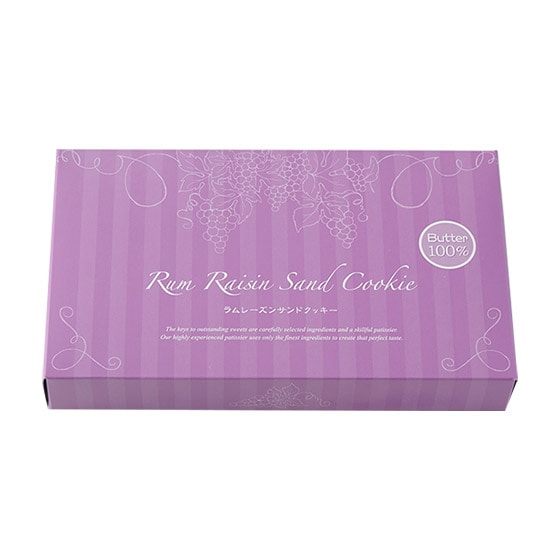 サンドしたバタークリームを楽しむため、クッキーはさっくり歯ごたえ良く仕上げ、レーズンの食感を楽しめえる様あえてバタークリームの上にレーズンをトッピングしてそれぞれの味を楽しめるようにしています。本品は洋酒を含まれますので妊婦の方やお子様はお気を付けください。