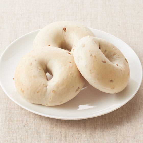 常温または、電子レンジ(目安:500wで約1分)で解凍後、横半分にスライスしてトーストすると、表面はサクッと香ばしく、中はもちもちの食感に仕上がります。また、お好みに応じてバターやクリームチーズを塗ったり、チーズやハムなどをはさんでベーグルサンドにしても一層おいしく召し上がれます。トーストする前にスライスした面に軽く水を噴霧すると、よりもちもち感が増しますので、ぜひお試しください。