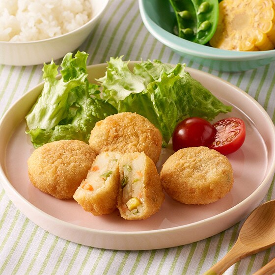おこさま向けのミニサイズコロッケです。味付けも砂糖・醤油・塩とシンプルにしていますので、野菜の甘みをお楽しみいただけます。油であげておりますので電子レンジで温めるだけでお召し上がりいただけます。 ■具材が柔らかくなり過ぎないよう工夫しています