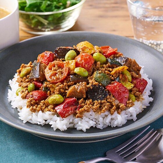 6種の野菜とみつもち豚のひき肉を使ったドライカレーです。 カレーソースには20種類以上の香辛料を使用し、コリアンダーやクミンなどのスパイスだけでなく、オレガノ・フェンネルなどのハーブも加えて味に深みが出るように仕上げました。 スパイシーな香りと辛さで、お皿の上をまるで専門店の本格的なカレーかのように演出してくれます。 ■お召し上がり方