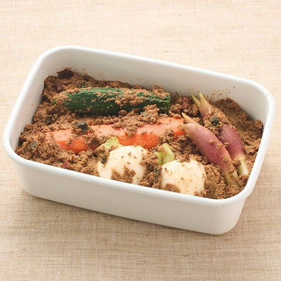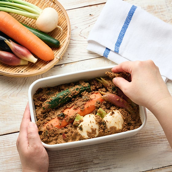 水洗いした野菜をそのまま、又は軽く塩もみしてぬか床に14-18時間漬けてください。 |