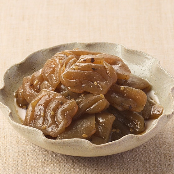 味がしみこみやすいように波型に加工した国産の生芋こんにゃくを使用し、シンプルな調味料で味付したこんにゃくのきんぴらです。 ■ほどよい甘さと歯ごたえのあるこんにゃくのきんぴらです。