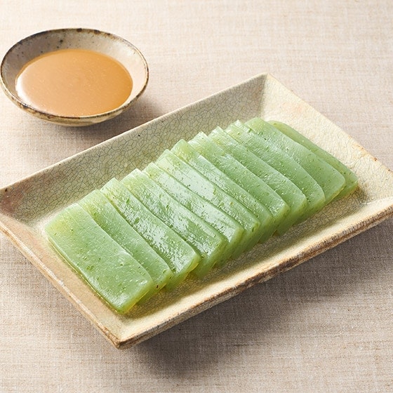 「バタ練り」と呼ばれる昔ながらの練り方で製造しています。通常の蒟蒻にくらべ「刺身こんにゃく」は口あたりをやわらかくするために原料の蒟蒻粉に対し水量を増やして作る方法もありますが、大島屋では水量を足さず低温で製造します。そのため朝方に仕込み、夕方には切り出し作業をおこないます。 ■お召し上がり方