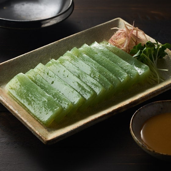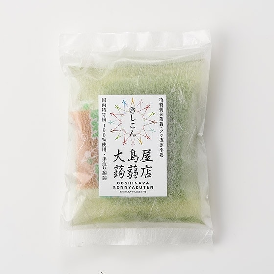 古式バタ練り製法で練り上げられたお刺身蒟蒻です。国産の青のりを使用した香り高い蒟蒻です。大島屋蒟蒻店は「おいしくて、おもしろくて、 かっこいい。」そんな蒟蒻をひとりでも多くの人に楽しんで貰えるように、製造をおこなっています。 ■古式バタ練り製法でつくっています