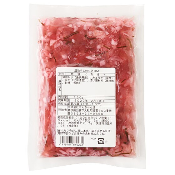 大人向けの漬物ちらし寿司です。 島根県産の津田かぶと国産のみょうがの漬物のシャキシャキっとした食感と酸味の効いた口あたりが特長で、一般的な五目寿司とはまた違ったおいしさが楽しめます。そのまま食べるのはもちろん、お家にある食材をプラスしてサラダ寿司にしたり、お刺身をのっけて海鮮丼にしたり、色々楽しめます。忙しい日のかんたんメニューの一品に、お刺身やローストビーフをのせれば、お手軽豪華飯に。 2合のごはんに混ぜるだけで、手軽においしいちらし寿司(漬物寿司)が完成します。 ■島根の伝統野菜「津田かぶ」を使用。