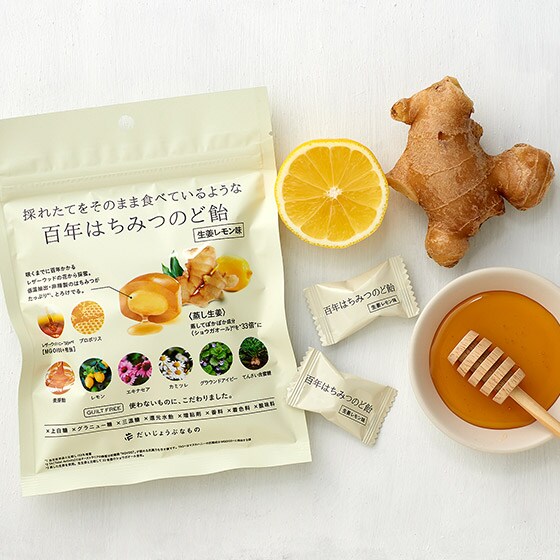 ■ピリっと辛い蒸し生姜の飴から百年はちみつがとろけ出すのど飴。