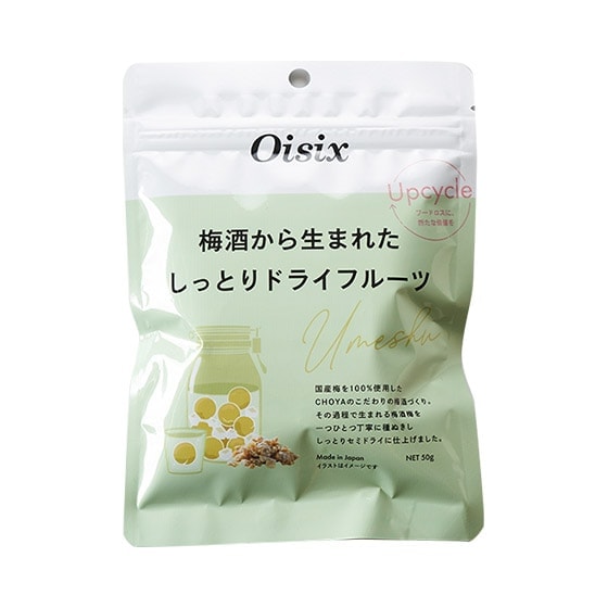 梅酒梅製造の過程で使用する梅の実を取り出して、丁寧に種を抜き梅酒製造工程の熟成を活かしたしっとりとしたドライフルーツに仕上げました。1袋(50g)で約118gの梅酒梅をアップサイクルして活用しています。この取り組みは、フードロス削減だけでなく、梅酒に使用した後の梅を産地で再び買い戻し、生産者が自らドライフルーツに加工することで産地での雇用を確保して生産者の収入やモチベーションにつながる取組になります。