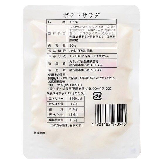 | 原材料 | じゃがいも(国産)、マヨネーズ(卵・大豆を含む)、玉ねぎ、人参、砂糖、食塩、シトラスファイバー、こしょう、発酵調味料(小麦を含む)/香辛料抽出物 |
