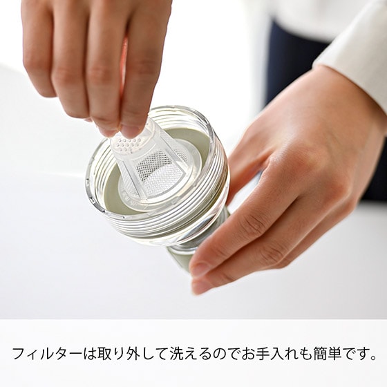 飲み口と本体はPCT樹脂で、BPA FREE・透明性・耐熱性・衝撃強度のある安心素材です。フィルターが付いているのでお好みの水出し茶やフルーツティーを持ち歩くことができます。お好みの飲み物や水出し茶・フレーバーウォーターを持ち歩けます。フィルター付きなので抹茶シェイカーとしてお使いいただけます。飲み口の内側にフィルターメッシュがセットされています。食洗機使用可。電子レンジ使用不可。