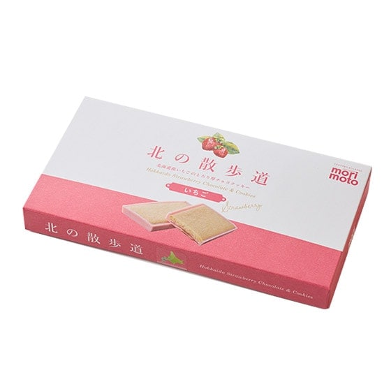 「北の散歩道(いちご)」では、北海道産いちごを使用。 さわやかな酸味が特長のコンフィチュールは、一口食べると口の中にいちごの香りと味わいがひろがります。 北海道産小麦で作ったサクッとした食感のクッキーと、いちごのチョコレートのハーモニーも程よく、甘みとさわやかな酸味が絶妙の一品です。 ■お召し上がり方