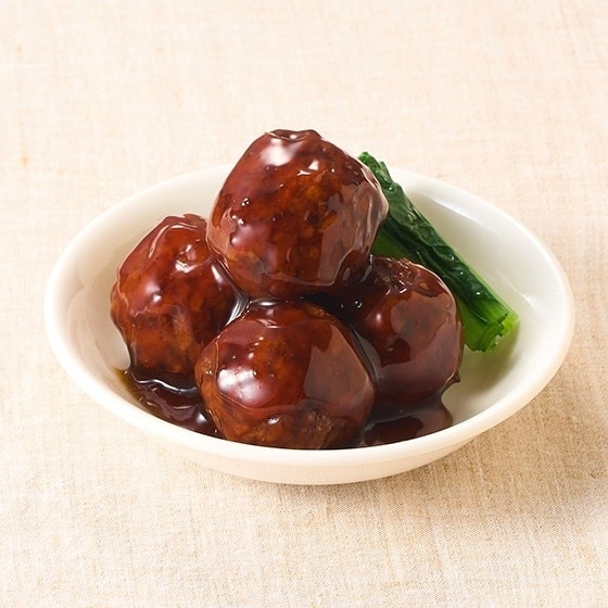 1個約23gのサイズの肉だんごに特製甘酢あんをあわせました。国産の鶏肉・豚肉・牛肉のほかに、豚脂を使用して旨味のある肉だんごに仕上げています。ソースはコク深い味わいを出すために三温糖や加工黒糖などを使用し、黒酢を効かせた甘酢あんです。れんこんのシャキシャキとした食感が特長の肉だんごと甘酢あんがよく絡み合い、ごはんが進むおいしさです。ボイル調理でかんたんに本格的な肉だんごをお楽しみください。 ■黒酢の香りをひきたたせました。