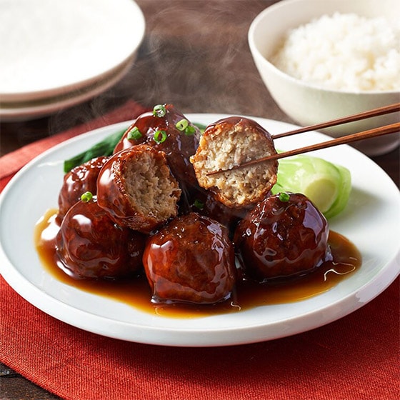 肉だんごはほぐれ感のある食感に仕上げるため、製造元独自の生地混合時間を設定しています。また、肉団子を揚げて加熱することにより、お店の作り方を再現しています。ソースは酸味が引き立つように醸造酢(黒酢を含む)は加熱の最終段階で投入しています。