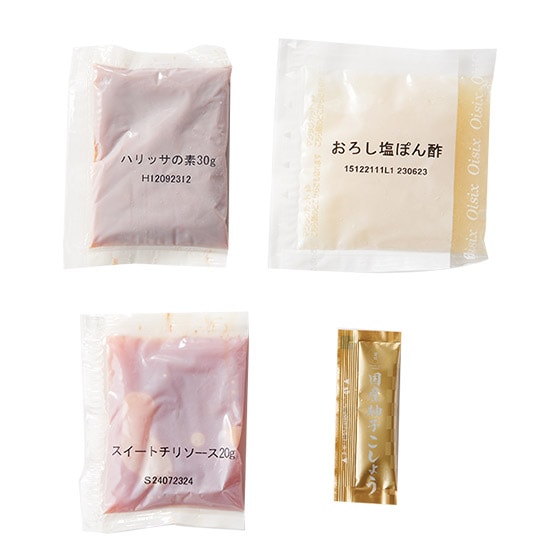 冷蔵庫で約30分-1時間解凍してください。料理の味をちょっと変えたい時に便利な調味料4種をアソートにしました。クミンの香りがあと引くハリッサ、荒摺りの大根おろしが入ってさっぱりとした味わいのおろし塩ポン酢、辛さと甘さと組み合わせがたまらないスイートチリソース、爽やか香りが楽しめる柚子胡椒です。ぜひお気に入りを見つけてください!