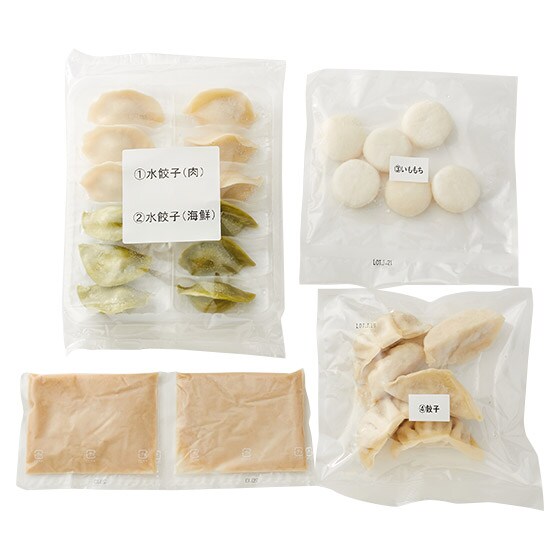 ■水餃子(肉)、水餃子(海鮮)、餃子、いももちを野菜と合わせて、白湯スープでお召し上がりください。