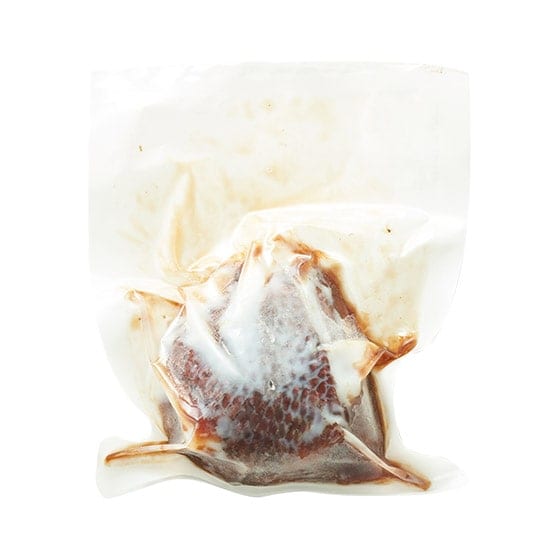 オーブンでローストしたあい鴨をタレと一緒に袋詰め後、真空パックにしてから蒸庫でじっくり調理する際に出る肉汁とタレが混ざり加熱されることで上質なソースができ上がっています。