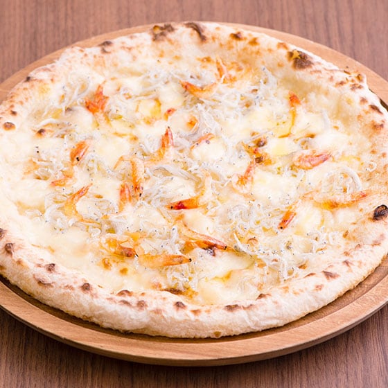 シラスと桜えびをトッピングしたピザです。シンプルながらシラスの風味と桜えびの香ばしさが楽しめるピザです。隠し味のパルメザンチーズでコクを加え、さらにおいしさをアップしています。 国産小麦使用の石窯で焼いたピザ生地は小麦粉の香りが高くモチモチの食感です