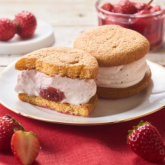 いちごクリームといちごのコンポートをふわふわの生地で挟みました。 いちごクリームは北海道産生クリームとホワイトチョコレート、マスカルポーネチーズをブレンドして国産のいちごで香り豊かに仕上げ、いちごのコンポートは国産のいちごをコトコト煮込んで作りました。 通常のふんわりブッセいちごよりコンポートに粒感を残し、北海道産生クリームを2倍絞ったプレミアムバージョンです。 手作りのいちごのコンポートが良いアクセントになってやわらかな生地と調和します。 粉糖とドライいちごをトレーの底に忍ばせているので、そちらの面を上にしてお皿に盛り付けてお召し上がりください。 ■宮城県産の卵と牛乳を使用