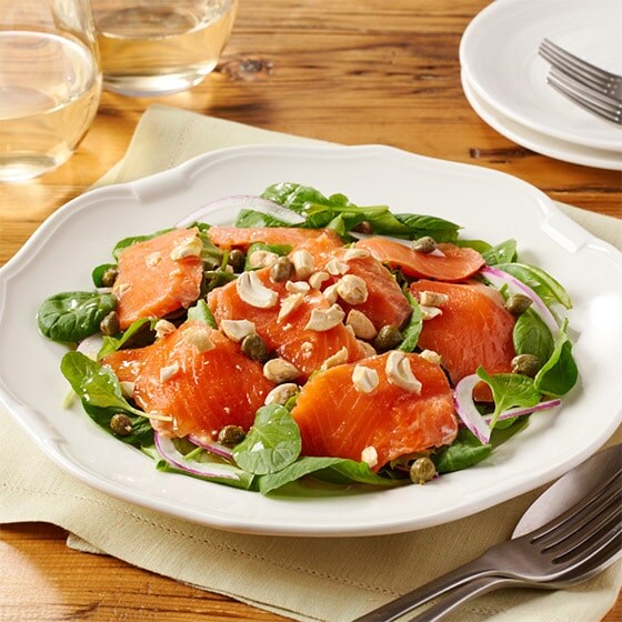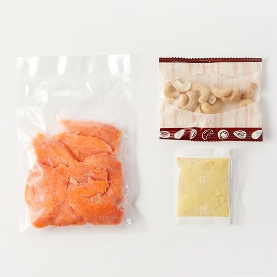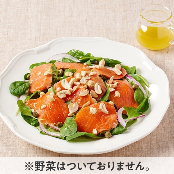 約10分流水で解凍後、袋から取り出したサーモンを、さらした玉ねぎやミックスリーフ・ディルなどお好みのお野菜(30g程度)の上に乗せ、最後に添付ドレッシングと砕いたカシューナッツを全体にかければ本格的なカルパッチョサラダのできあがりです。