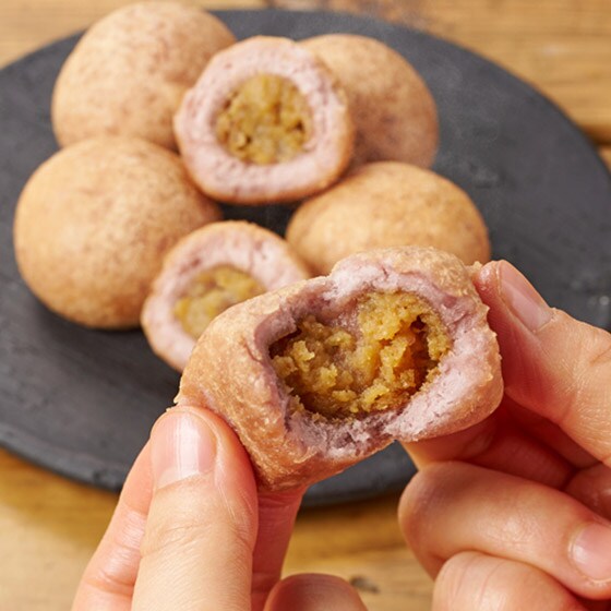 弾力のあるもちもち食感を出せるよう、使用する原料や水分量を調整して作りました。皮は、製造元オリジナルミックス粉・白玉粉・豆腐などを使い食感にこだわり、さらにムラサキ芋粉末も混ぜることで、外はむらさき・中は黄色になるよう仕上げました。もっちりしっかりとした食感に、やさしい、まろやかな甘さのプチボールです。 ■お召し上がり方