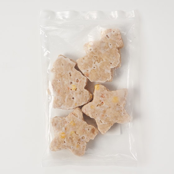 鶏むね肉と豚肉を主原料に彩りよくお野菜を加え、シンプルな味付けにまとめたハンバーグです。かわいいもみの木と星の形が2個ずつ入っています。 お子さまが食べやすいように、鶏肉感があるやわらかな食感に仕上げ、スパイスやハーブの味付けを控えめにしています。 ■お召し上がり方