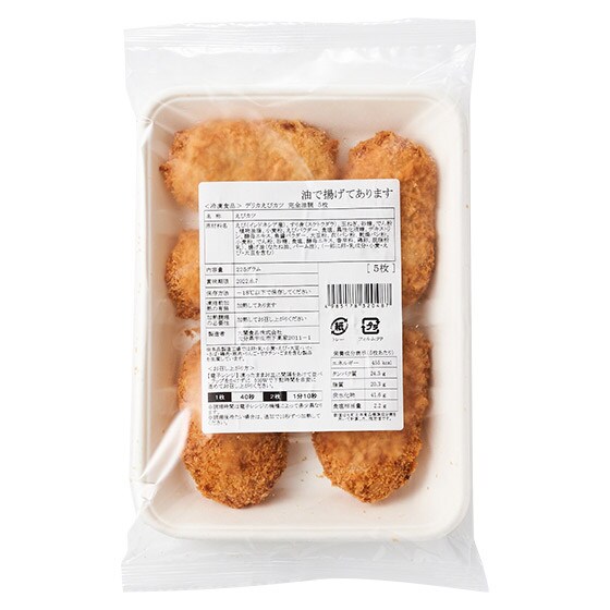 | 原材料 | えび(ベトナム産、インドネシア産)、すり身(スケトウダラ)、玉ねぎ、砂糖、でん粉、植物油脂、小麦粉、えびパウダー、食塩、酵母エキス、魚醤パウダー、大豆粉、衣(パン粉、乾燥パン粉、小麦粉、でん粉、砂糖、食塩、酵母エキス、香辛料、鶏卵、脱脂粉乳)、揚げ油(なたね油、パーム油)、(一部に卵・乳成分・小麦・えび・大豆を含む) |