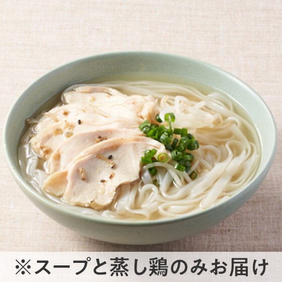 11種の和漢スパイスや香味野菜を配合した特製のエスニック風スープにやわらかい国産鶏の蒸し鶏をセットアップした商品です。 フォーやそうめんなどお好みの麺と一緒にお召し上がりください。赤玉ねぎ、パクチー、ライムなどのトッピングがおすすめです。温かいスープでも冷たいスープでもどちらでもおいしくお召し上がりいただけます。少し濃い目にでき上がりますのでお野菜の量は水の量で調整してください。麺、トッピングのお野菜はご自宅でご用意お願いします。 ■11種の和漢スパイス入り